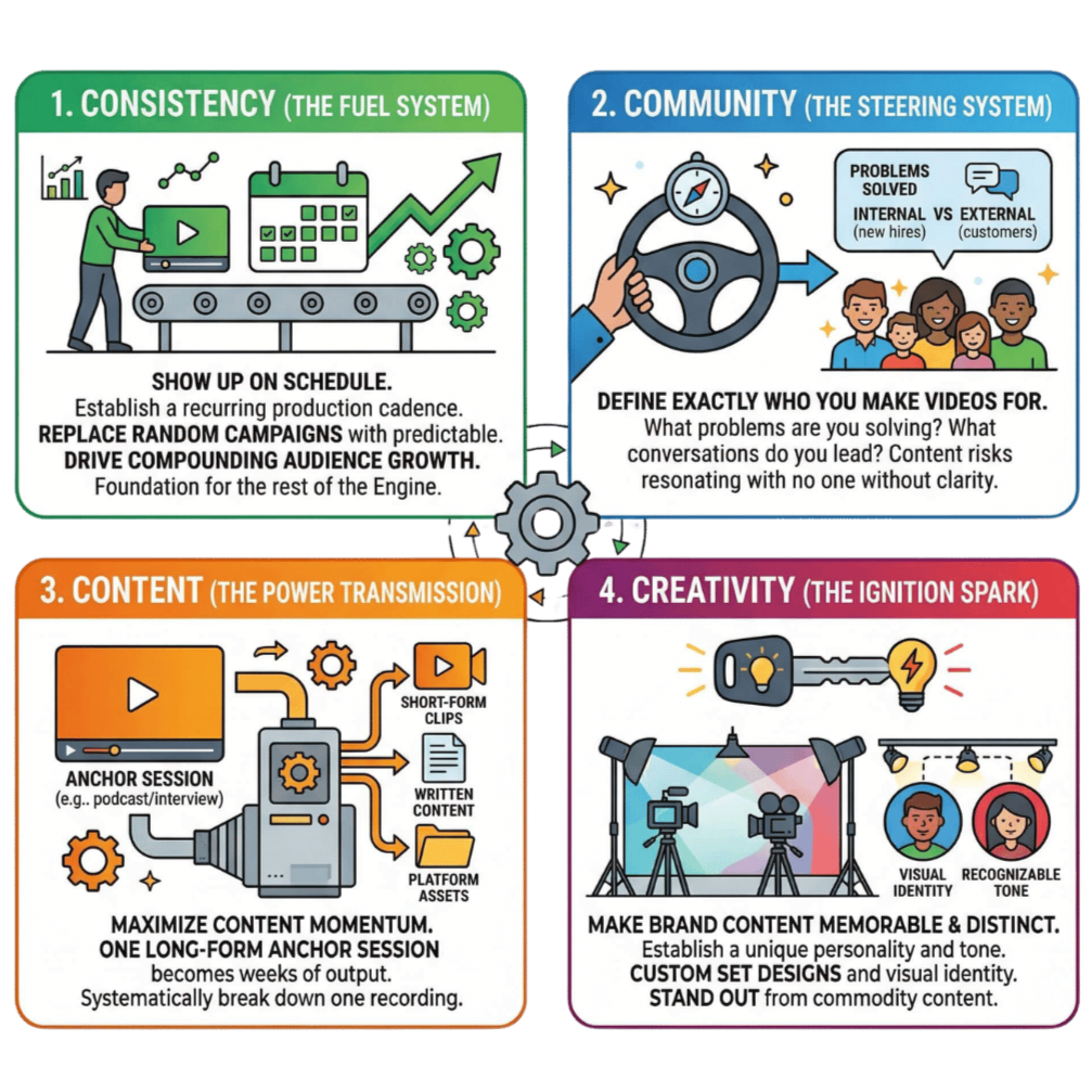 The Video Brand Engine is a structured system that transforms your company into a consistent, authority-building media presence. It starts with one strategic long-form video per week — your anchor — and multiplies it across every platform your audience lives on.